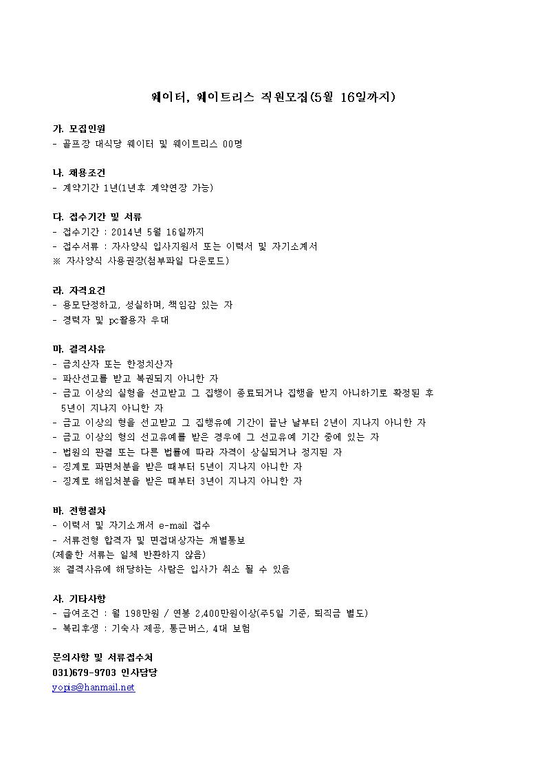 웨이터, 웨이트리스 직원모집(5월 16일까지) 2014.05.09