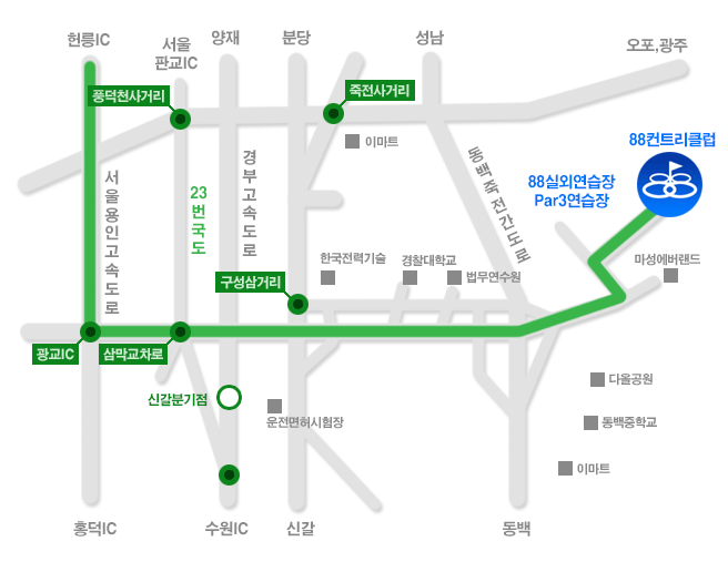 흥덕방면 직진 → 동수원IC 상현동방면 우측 출구 → 광교상현IC에서 우측방향 → 고가도로 진입 후 직진 → 삼막곡 제2지하차도 직진 → 88골프장